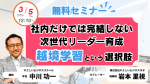 無料「ランチタイム」セミナー開催! 3/5 (木) 12:10〜12:55 第4回「社内だけでは完結しない、次世代リーダー育成 越境学習という選択肢」 「次世代のリーダーが育たな...