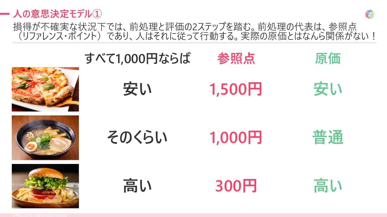 参照点: 価値の判断は絶対的な数値ではなく、過去の経験やその場の雰囲気」**で作られた基準(参照点)からのズレで決まります。例えば、ピザの1000円は安く感じても、ハンバーガーの1000円を高く感じるのはこのためです。